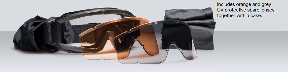 The distinct uvex apache goggle with ist modern sporty design delivers optimum wearer comfort and is incredibly durable. The stable, wide-vision goggle with flame-retardant headband and permanent anti-fog coating offers reliable protection ? and comes in a set including orange and grey UV protective spare lenses as well as a pouch.